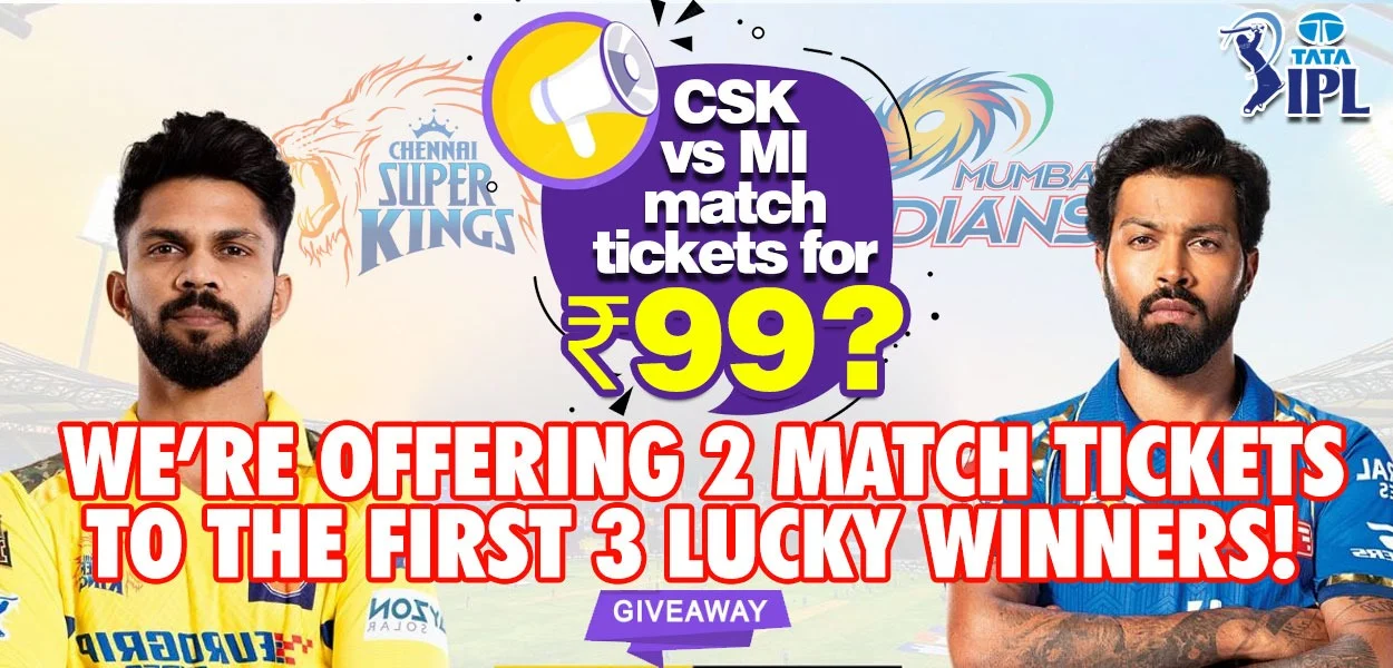 ★ We’re giving away 2 exclusive CSK vs MI match tickets for just Rs.99 each! ★ CSK vs MI tickets are waiting for YOU! ★